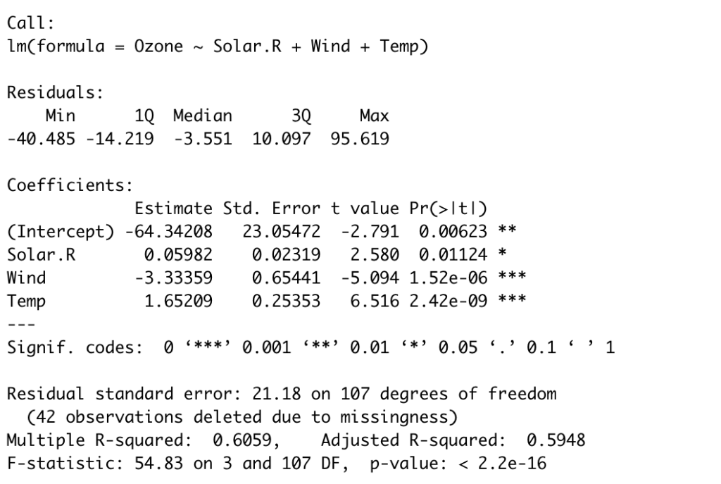 a<- lm(Ozone ~ Solar.R+Wind+Temp)